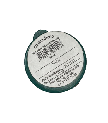 Caja para la recolección de muestra coprológica con tapa de ajuste a presión con pestaña lateral, con pala plástica al interior y etiqueta para registrar la información del paciente. Presentación: Unidad.